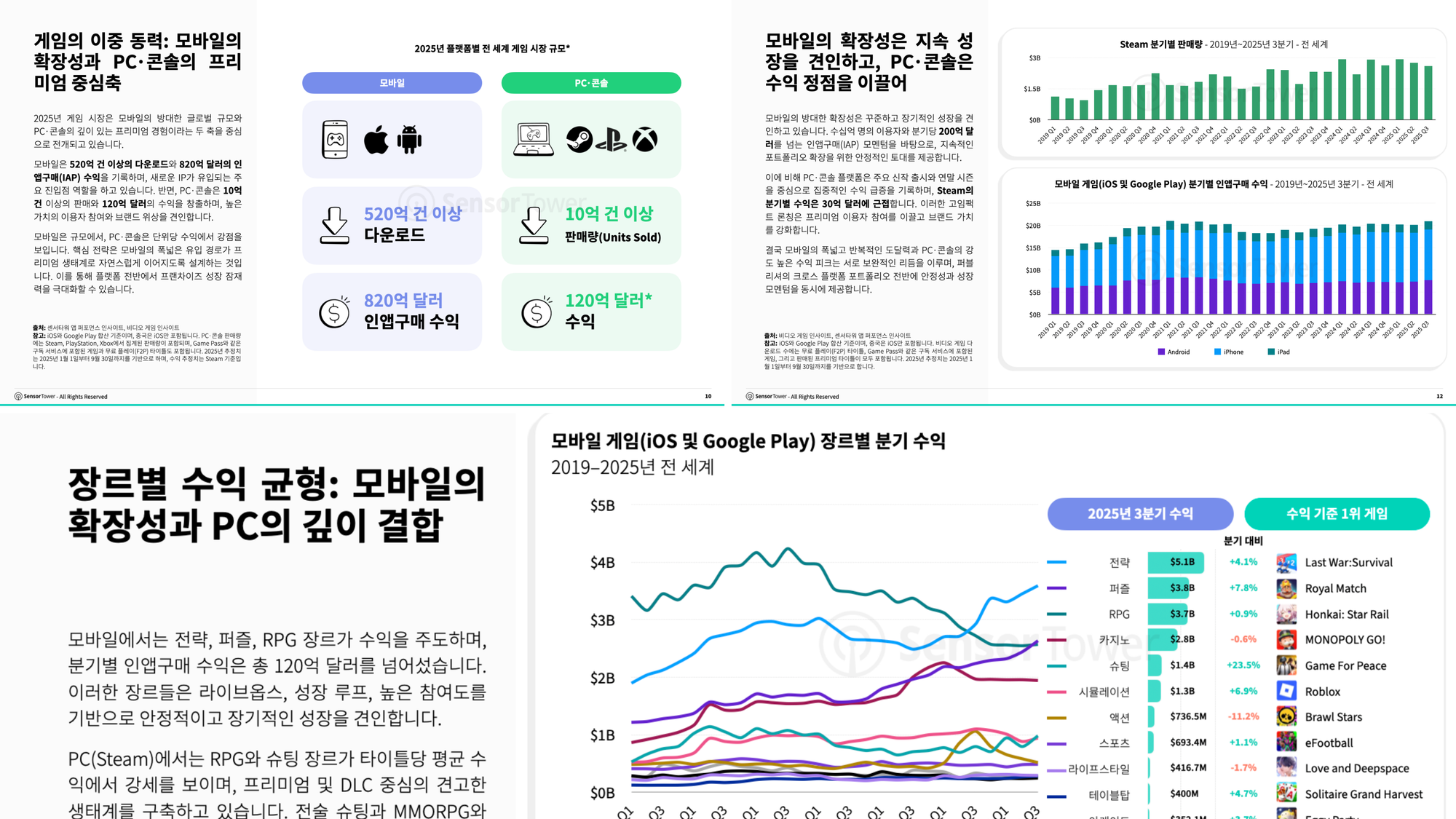 모바일에서는 전략, 퍼즐, RPG 장르가 수익을 이끌며, 분기별 인앱구매 수익은 120억달러를 넘어섰다. 이들 장르는 라이브옵스와 성장 루프, 높은 참여도를 기반으로 안정적인 장기 성장을 견인하고 있다.
