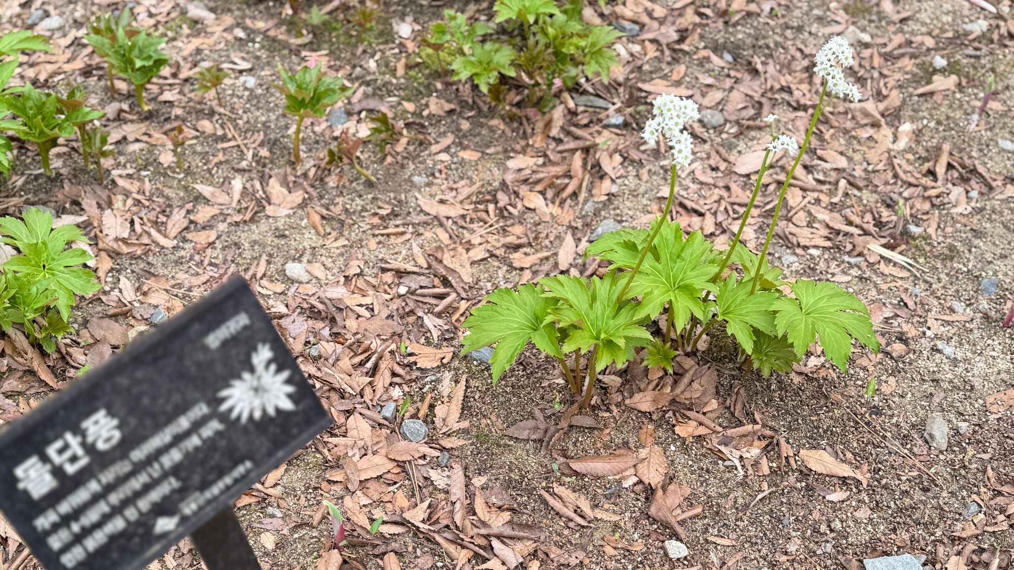 사람들의 발길이 닿지 않는 숲 속 한켠에서는 조용한 봄의 기적도 펼쳐지고 있었다. '돌단풍'이라 적힌 안내판 옆으로 하얀 꽃을 피운 야생화 한 포기가 낙엽 사이를 뚫고 힘차게 솟아올랐다. 큰 나무의 그늘 아래에서도 봄은 어김없이 찾아왔다.