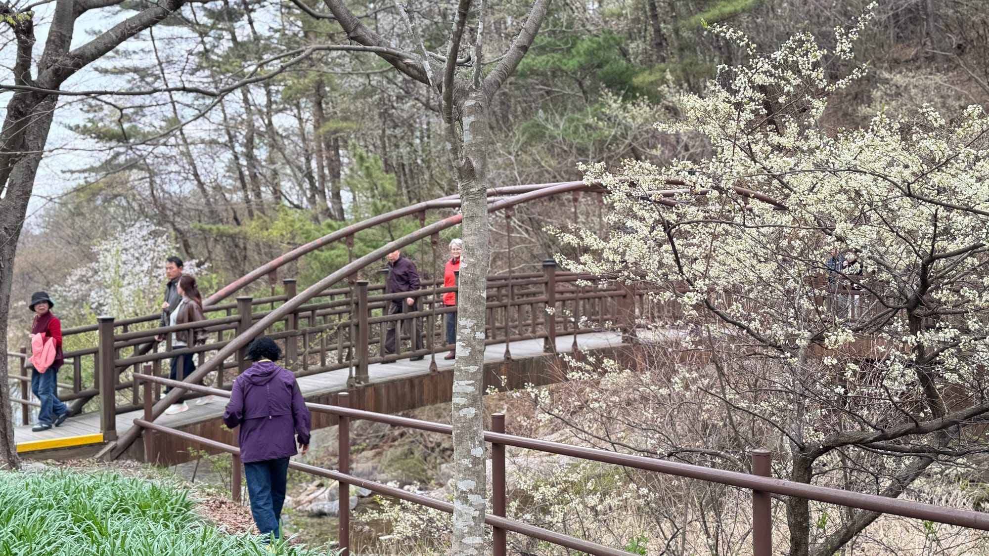 계곡을 가로지르는 아치형 나무다리 위에도 사람들의 발길이 이어졌다. 다리 주변 나무마다 흰 꽃망울을 터뜨려 탐방객들의 시선을 사로잡았고, 곳곳에서 사진을 찍는 손길이 분주했다. 봄 햇살에 반짝이는 계곡물 소리가 산책의 여운을 더했다.