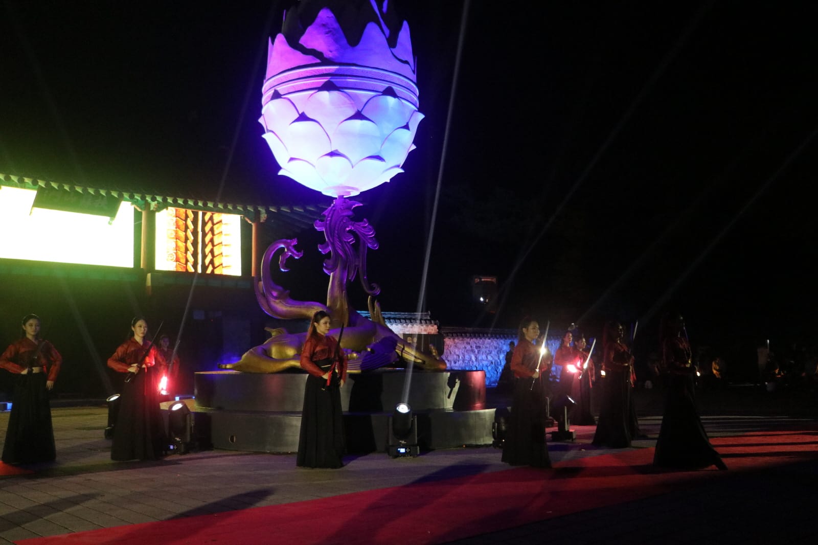 행사의 서막을 연 축하공연은 관객들을 백제의 황금기로 이끌었다. 전통무용팀 달빛유랑은 ‘사비연희’라는 주제로 성왕의 사비천도와 사비백제 123년의 시작을 우아한 춤사위로 표현했다. 이어 SWORLD의 ‘도화, 칼에서 피는 꽃’은 백제의 강성함과 화려함을 여무사의 유려한 검무로 표현하여 관객을 압도하였다.