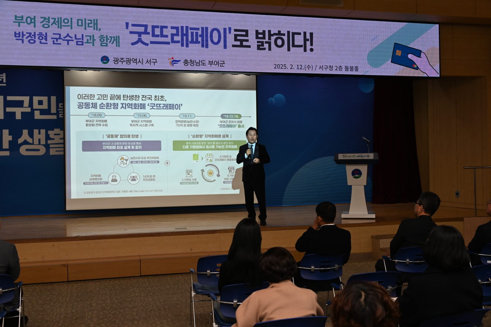 또한 박 군수는 광주 서구 공무원들을 대상으로 골목상권과 민생경제를 살린 공동체 순환형 지역화폐 굿뜨래페이와 3년 연속 종합청렴도 1등급 달성, 숨은 독립유공자 발굴, k농업 굿뜨래 농업 국제화 사업을 발표하며 부여의 특장점을 벤치마킹할 기회의 창을 열었다.