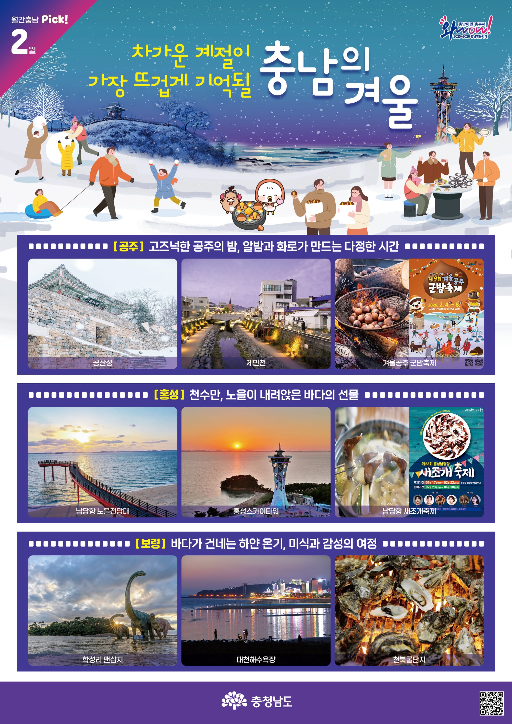 충청권 고속도로 휴게소와 연계한 관광지 입장료 할인 등 가성비 높은 여행 정보와 더 상세한 겨울 여행지 소식은 충남관광 누리집 또는 월간 충남 2월호 정보무늬(QR코드)를 통해 확인할 수 있다.
