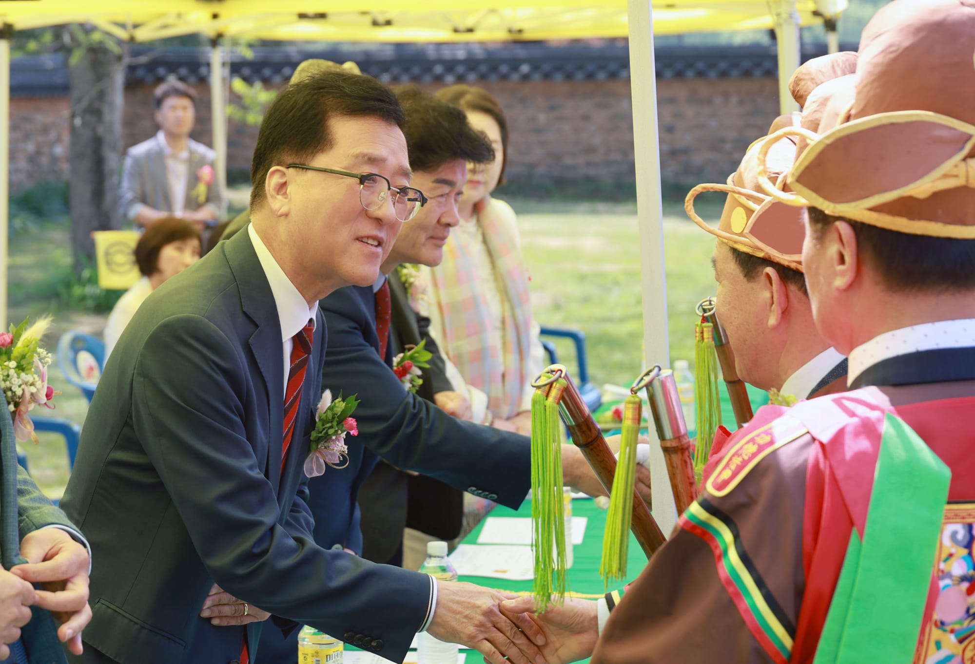 조원휘 의장이 수운천사 탄강 제204주년 기념 봉축법회에 참석해 관계자들과 악수하고 있다. /SNS 타임즈