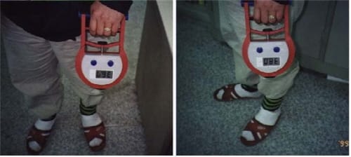 아래 사진은 수맥 위에 세워 테스트기로 힘을 측정하는 모습으로 수맥 위에서는 36.7Kg이었으나, 수맥이 흐르지 않는 곳에서는 원래의 힘을 쓸 수 있다. 정확도를 위해 디지털 테스트기를 사용했으며 수맥이 없는 곳에서는38.0Kg이었다.