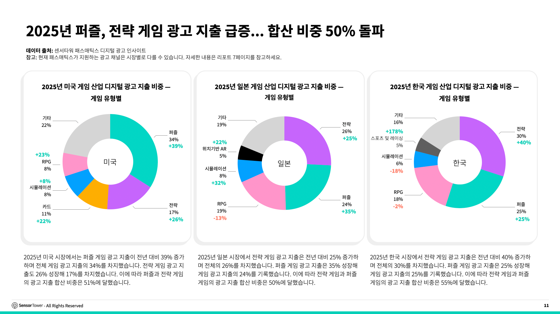 한국 시장에서는 해당 흐름이 더욱 뚜렷했다. 전략 게임 광고 지출은 전년 대비 40% 증가해 30%, 퍼즐 게임은 25% 증가해 25%를 기록했으며, 두 장르 합산 비중은 55%에 달했다.