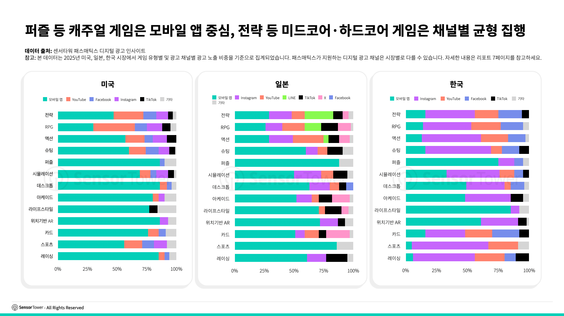 퍼즐 장르의 경우 미국, 일본, 한국에서 각각 86%, 88%, 75%의 광고 노출이 모바일 앱에서 발생했다. 반면 전략 장르는 다양한 채널에 분산된 집행 구조를 보였다.