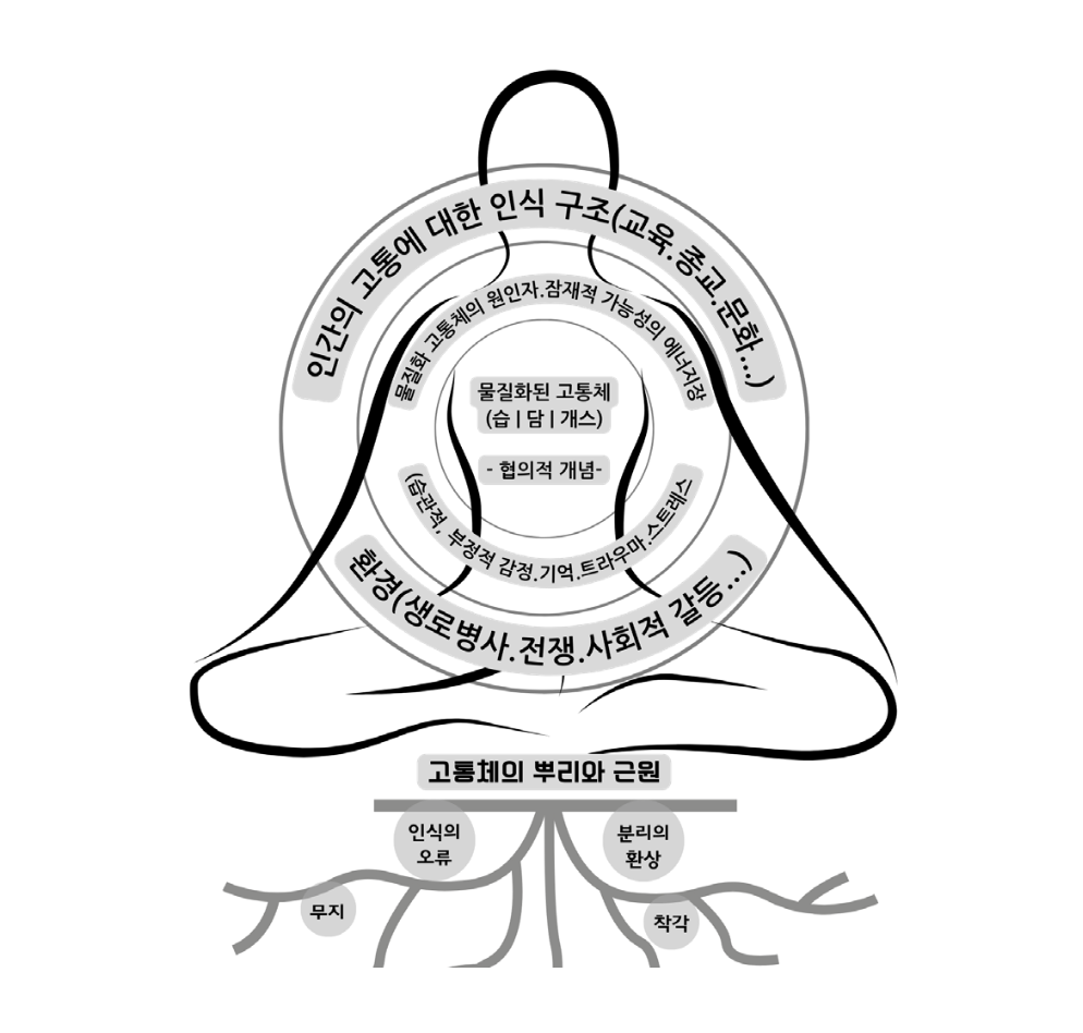 생소하고 다소 복잡한 인과 관계를 갖는 고통체를 정리하는 측면에서 그림으로 단순화해 살펴보면 그림 고통체의 계층화 구조와 같이 계층적으로 표현될 수 있다.