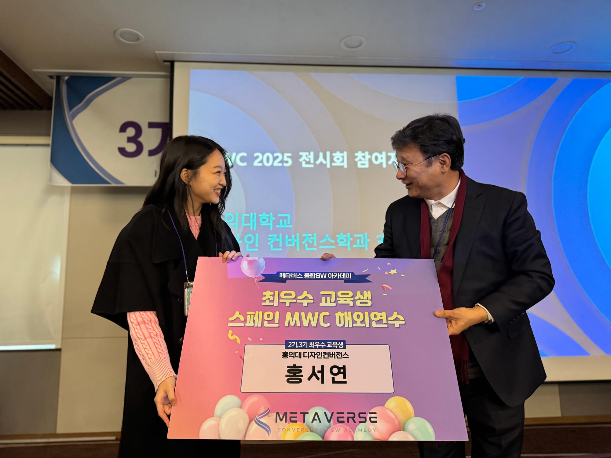 이날은 또, 메타버스 아카데미 3기 동안 가장 큰 혜택으로 평가받는 스페인 MWC 2025(모바일 월드 콩그레스) 참가 전액지원 선발 결과도 발표됐다. 1, 2, 3기를 통틀어 논문과 프로젝트, 성과물 등을 종합해 심사한 결과 디자인컨버전스학과 홍서연 학생이 수상의 영예를 안았다.
