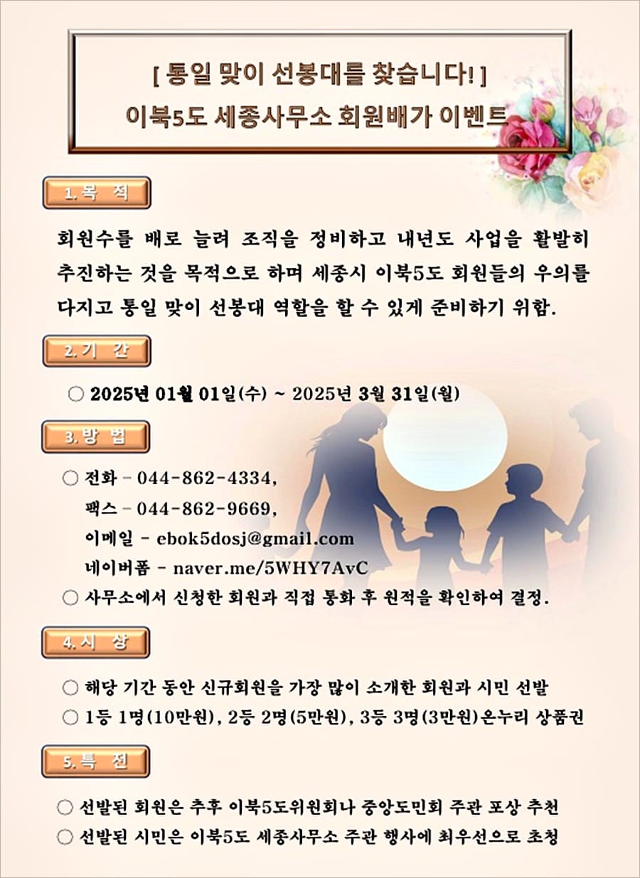 이북5도 세종사무소는 해당 기간 동안 신규회원을 가장 많이 소개한 회원이나 시민을 뽑아 온누리 상품권을 지급한다.