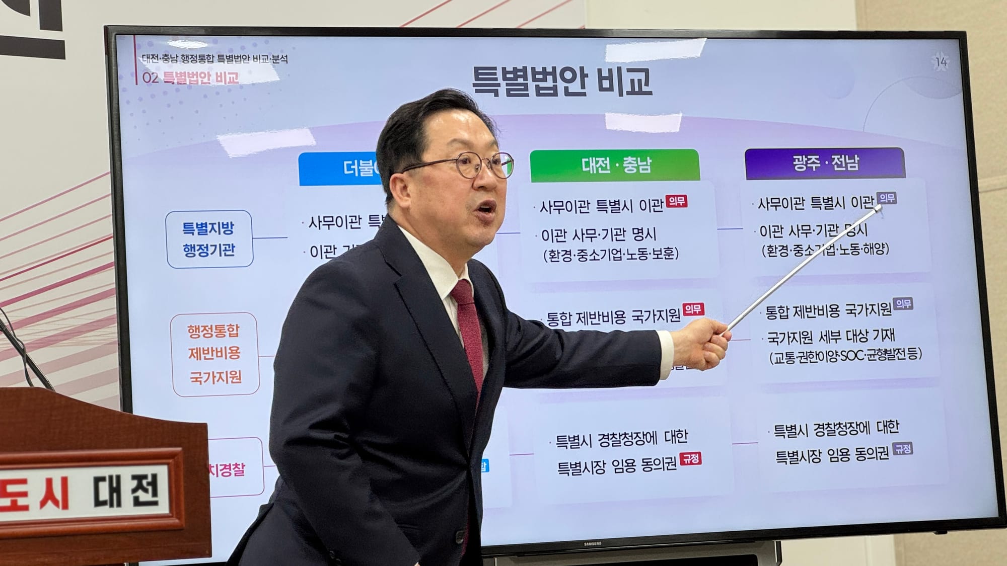 이 시장은 이날 회견에서 민주당 법안이 당초 대전·충남이 준비한 법안과 비교해 실질적인 자치권과 재정권이 대폭 축소됐으며, 특히 같은 날 발의된 '전남광주통합특별시 설치 특별법안'과 비교하면 심각한 차별이 있다고 주장했다. (관련 현장 live 방송: https://www.thesnstime.com/cungnam-daejeon-dansun-mulrijeog-haengjeong-tonghab-bandae-je4siribdoseogwan-2032nyeon-gaegwan-2-2il/)