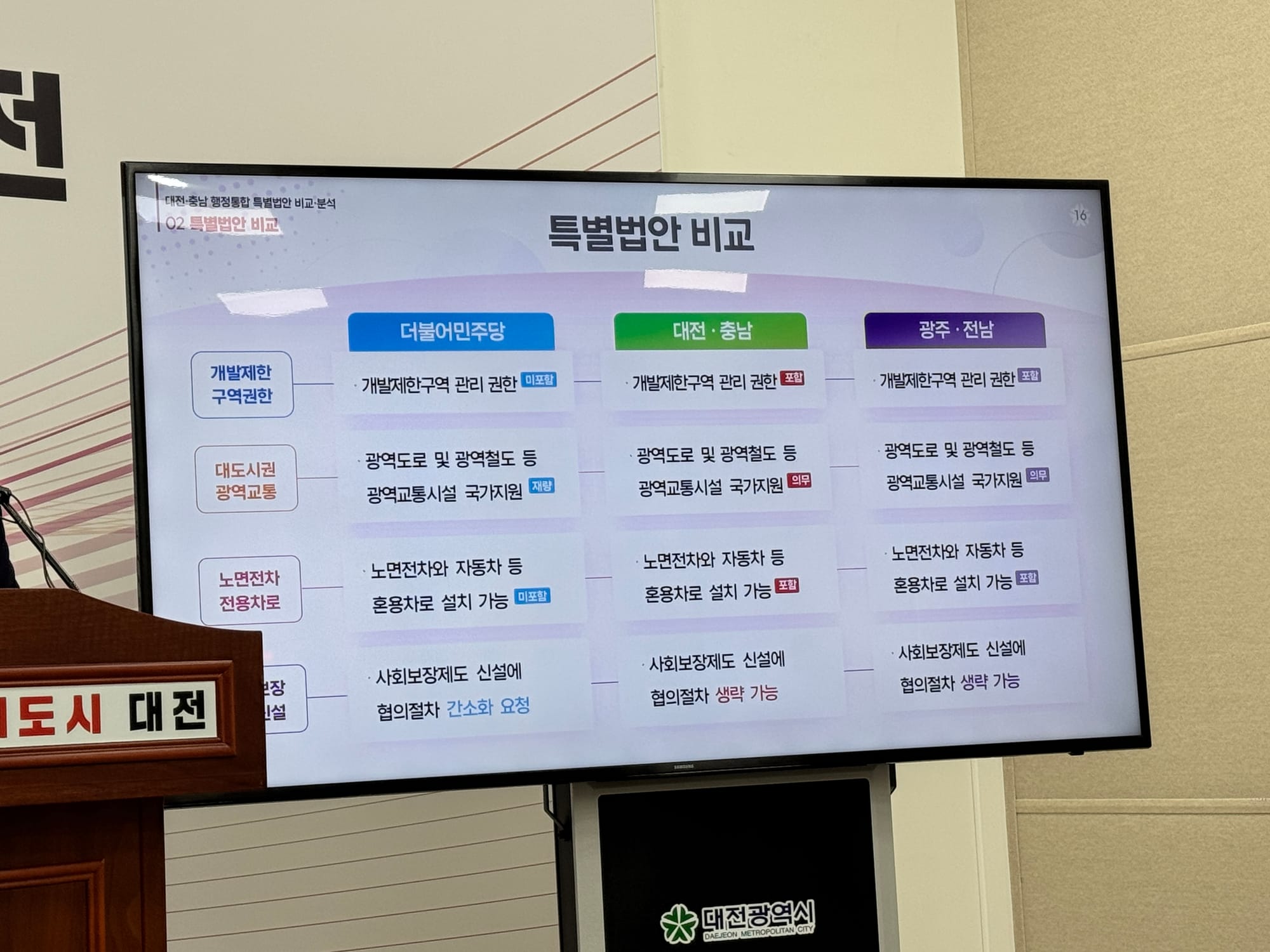 이 시장은 이날 회견에서 민주당 법안이 당초 대전·충남이 준비한 법안과 비교해 실질적인 자치권과 재정권이 대폭 축소됐으며, 특히 같은 날 발의된 '전남광주통합특별시 설치 특별법안'과 비교하면 심각한 차별이 있다고 주장했다. (관련 현장 live 방송: https://www.thesnstime.com/cungnam-daejeon-dansun-mulrijeog-haengjeong-tonghab-bandae-je4siribdoseogwan-2032nyeon-gaegwan-2-2il/)