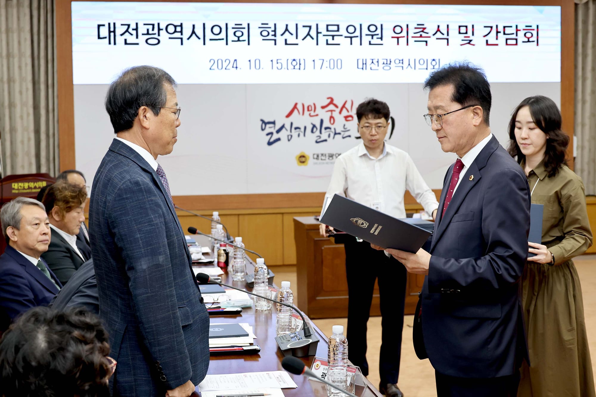 [SNS 타임즈] 대전시의회는 15일 시의회 소통실에서 대전광역시의회 혁신자문위원 위촉식 및 간담회를 갖고, 대전시의회의 역사 이래 최초로 의장 직속 ‘대전광역시의회 혁신자문위원회’의 공식 출범을 알렸다.