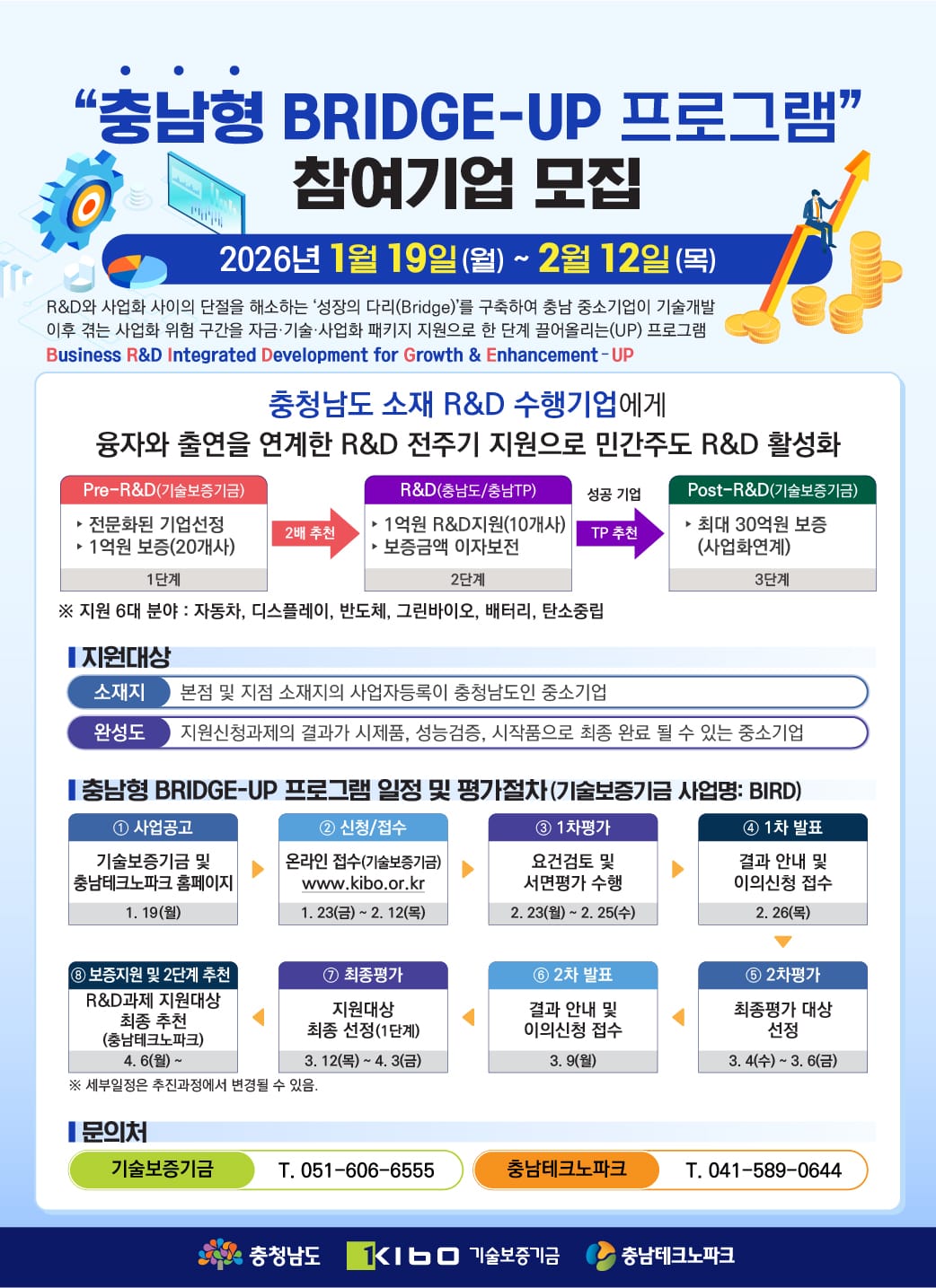 도는 14일 기술보증기금, 충남테크노파크와 협력해 '브릿지-업(BRIDGE-UP)' 프로그램을 본격 운영한다고 발표했다. 이는 도정 차원에서 처음으로 시도하는 정책자금 연계형 R&D 지원 사업으로, 총 700억 원 규모의 종합 지원책이다.
