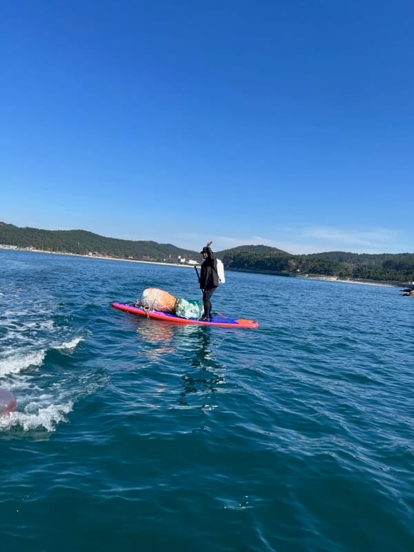 이날 참석자들은 섬과 해안, 해안 절벽 등 해식지형에 접안이 용이한 카약과 스탠드업패들보드(SUP)를 활용해 신진항에서 갈음이해수욕장, 마도 일원까지 해양플라스틱을 수거했다.
