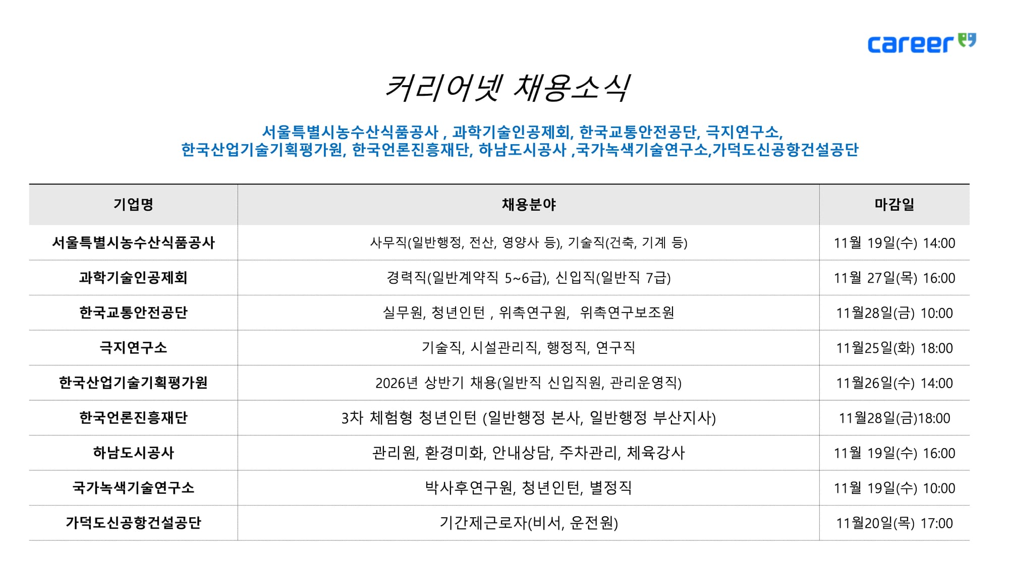 [SNS 타임즈] 취업 포털 커리어가 서울특별시농수산식품공사, 과학기술인공제회, 한국교통안전공단, 극지연구소, 한국산업기술기획평가원, 한국언론진흥재단, 하남도시공사, 국가녹색기술연구소, 가덕도신공항건설공단 채용 소식을 17일 발표했다.