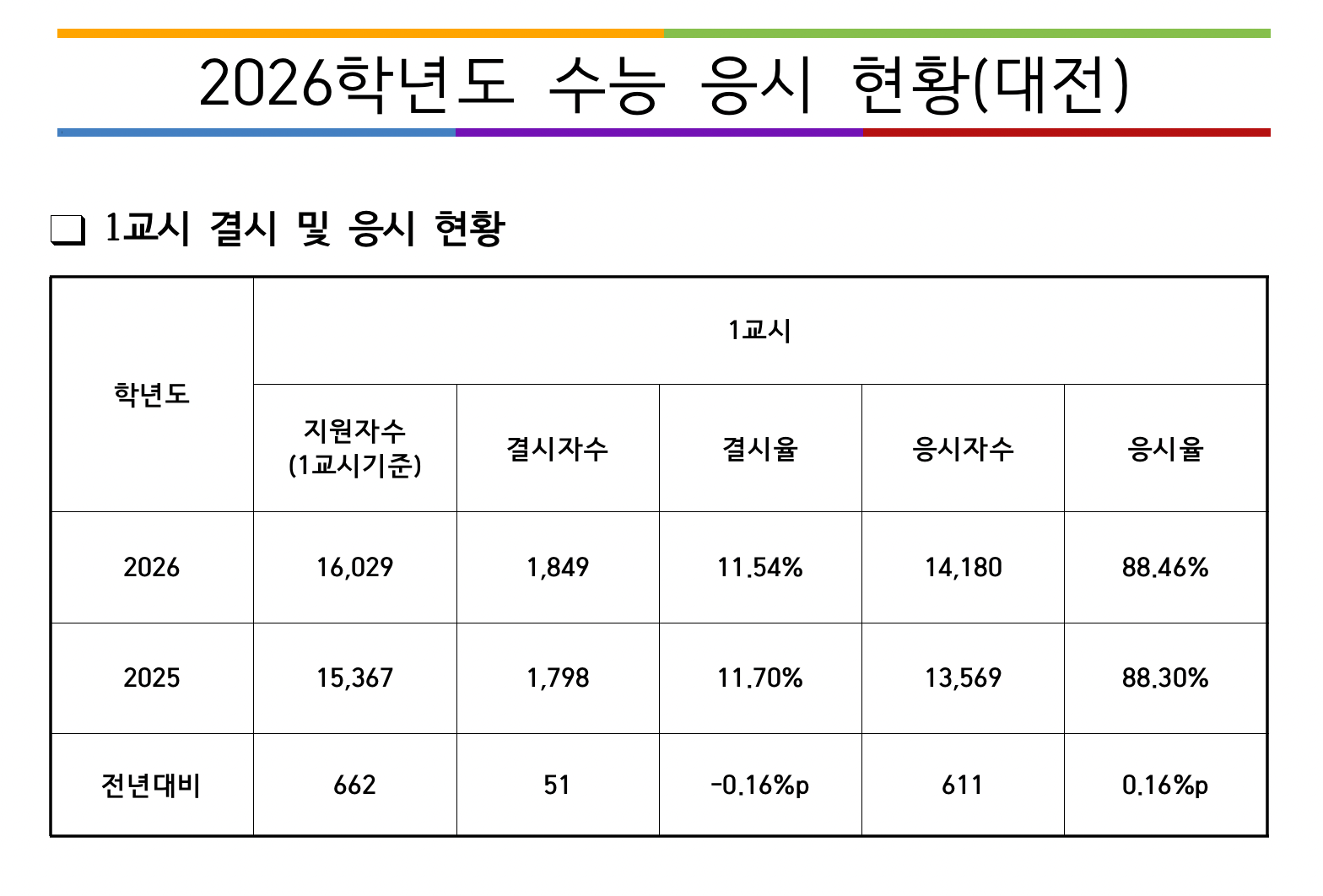 대전시교육청이 발표한 1교시 응시 현황에 따르면, 올해 대전지역 수능 지원자 수는 16,029명(1교시 기준)이며, 이 중 1,849명(11.54%)이 결시하고 14,180명(88.46%)이 응시했다.