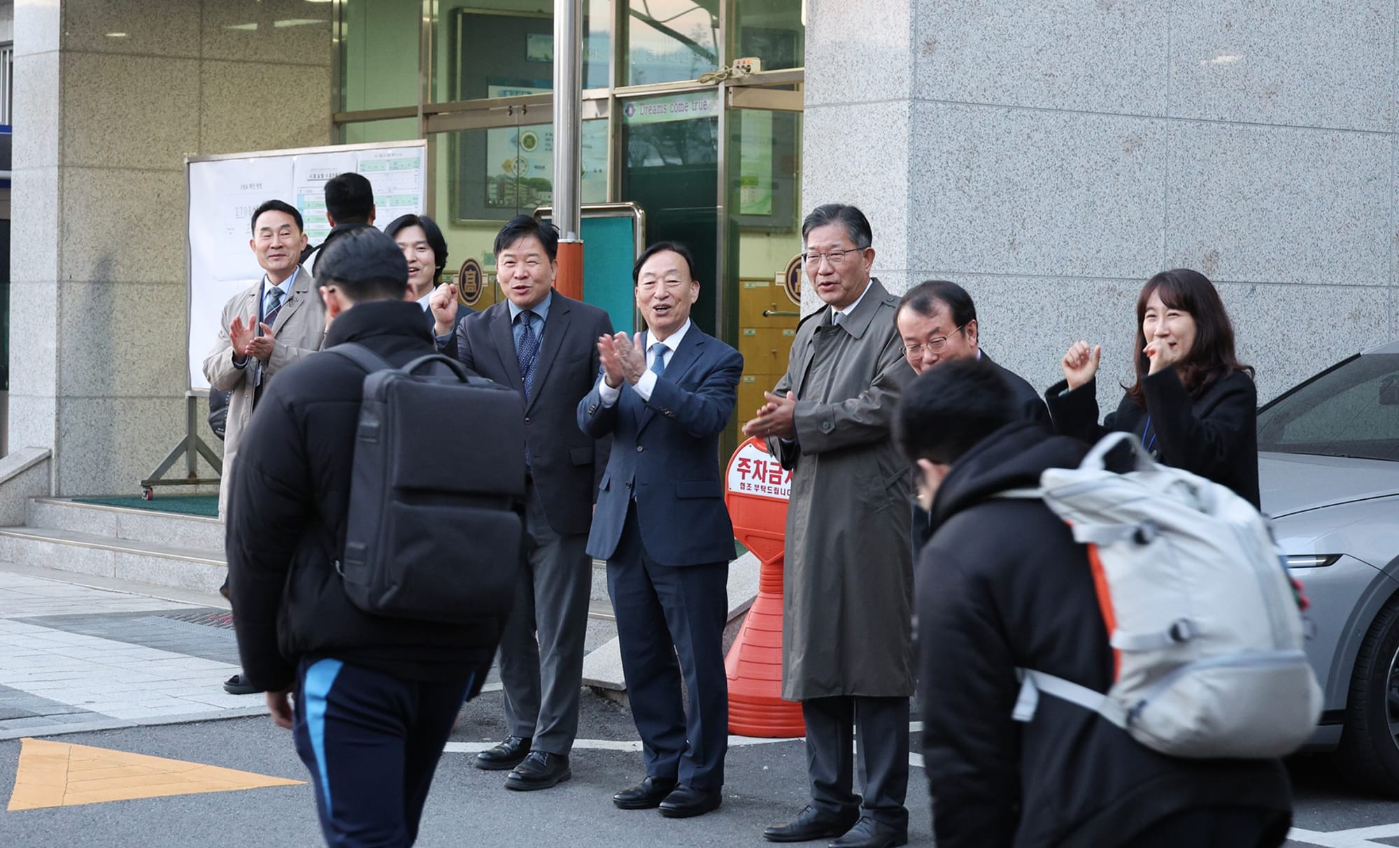 설 교육감과 참석자들은 시험장 입구에서 수험생들을 향해 힘찬 주먹을 들어 올리며 "파이팅!"을 외쳤다. 이날 동대전고 앞에는 학부모와 후배들도 함께 모여 수험생들의 선전을 기원했다.