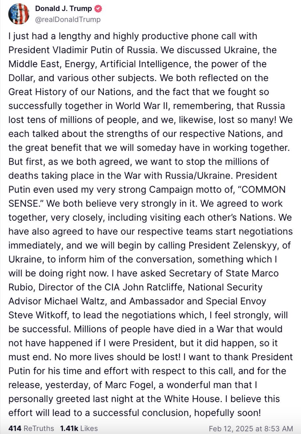 트럼프는 "내가 대통령이었다면 일어나지 않았을 전쟁으로 수백만 명이 사망했다"면서, "더 이상의 생명이 희생되어서는 안 된다"고 강조했다. 그는 이어 협상이 조만간 성공적으로 마무리될 것이라는 기대감도 표명했다.